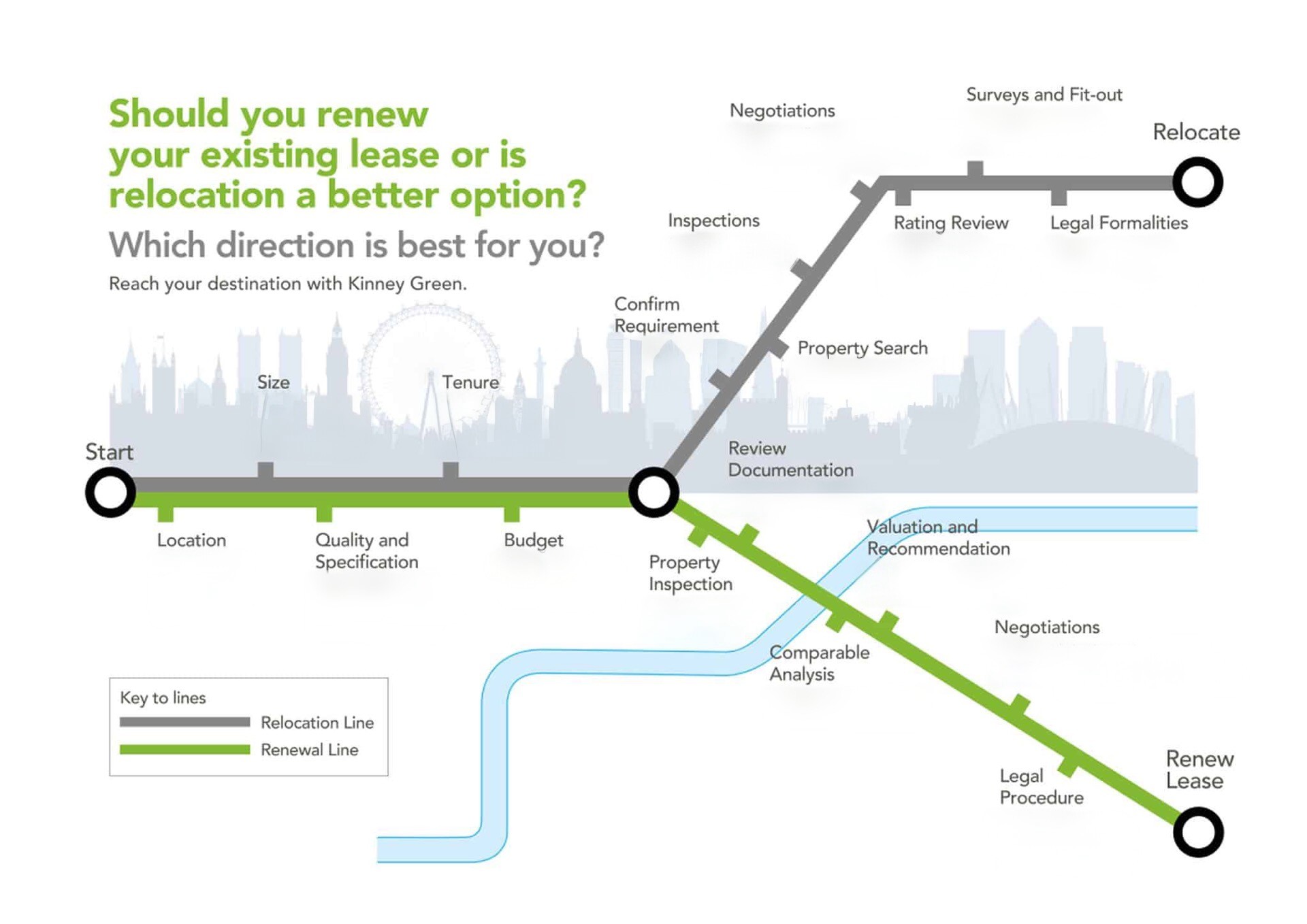 Making the right property decision can have a major impact on your business performance, costs, and flexibility. At Kinney Green, we help you navigate every step, from evaluating your current space to negotiating new opportunities , ensuring you reach the right destination for your future needs.